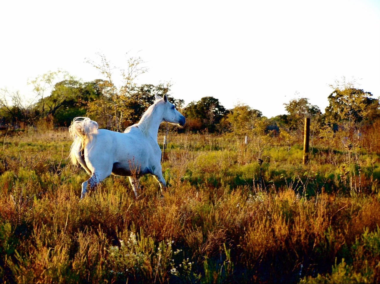 My grey mare moves between Mesquite and Persimmon trees